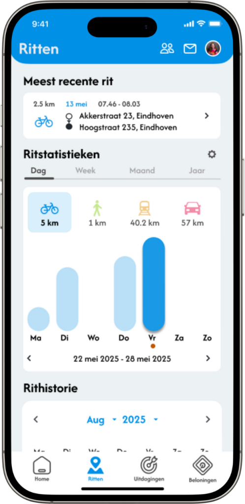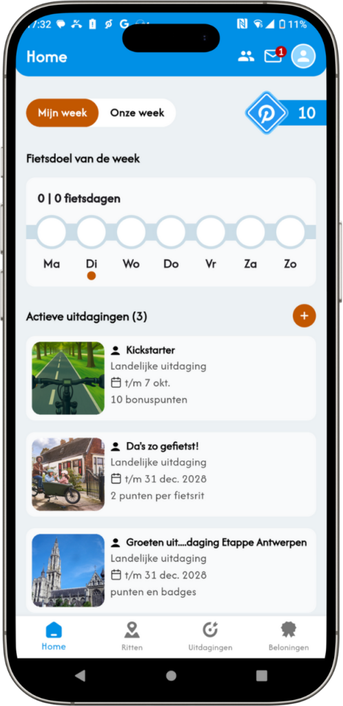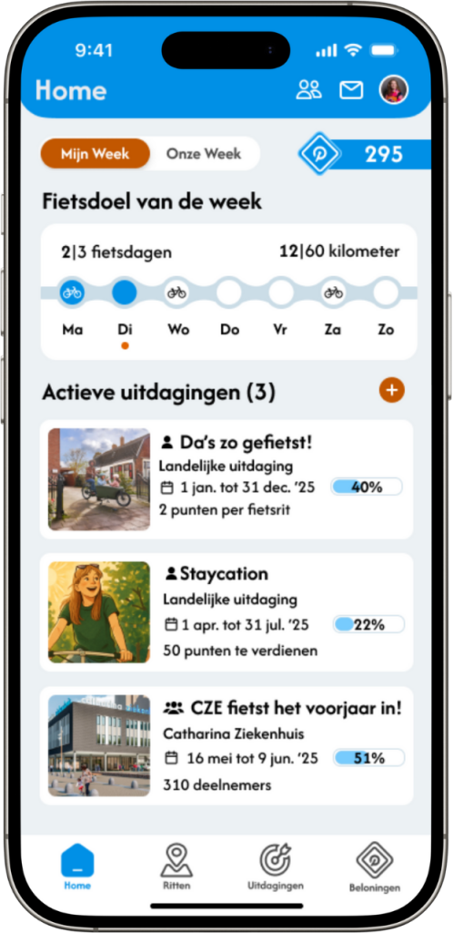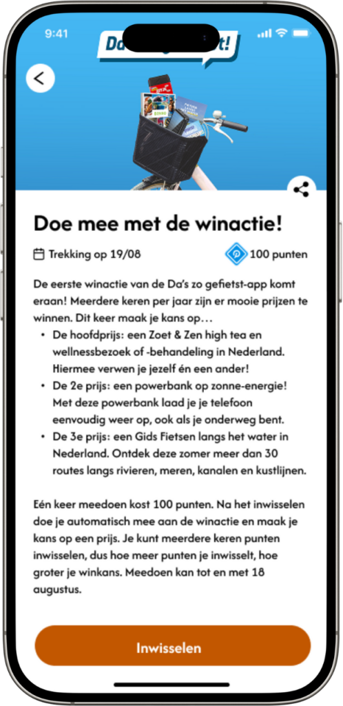 Met de landelijke fietsapp Da’s zo gefietst wordt fietsen nog leuker. Je houdt eenvoudig je ritten bij, spaart punten en wisselt ze in voor leuke beloningen. Door te fietsen verdien je punten die je kunt gebruiken voor kortingen, winacties of donaties aan goede doelen. Zo maak je bijvoorbeeld kans op een tegoedbon voor de lokale bakker of korting bij de fietshandelaar. Ook organisaties profiteren, want de app stimuleert duurzame mobiliteit op een positieve manier. Teams kunnen samen uitdagingen aangaan en meedoen aan fietsacties. Elke rit telt mee, of je nu naar je werk fietst, door de regen rijdt of tien ritten in een maand maakt. In het overzicht zie je al je ritten terug en ontdek je hoeveel punten je hebt verdiend.